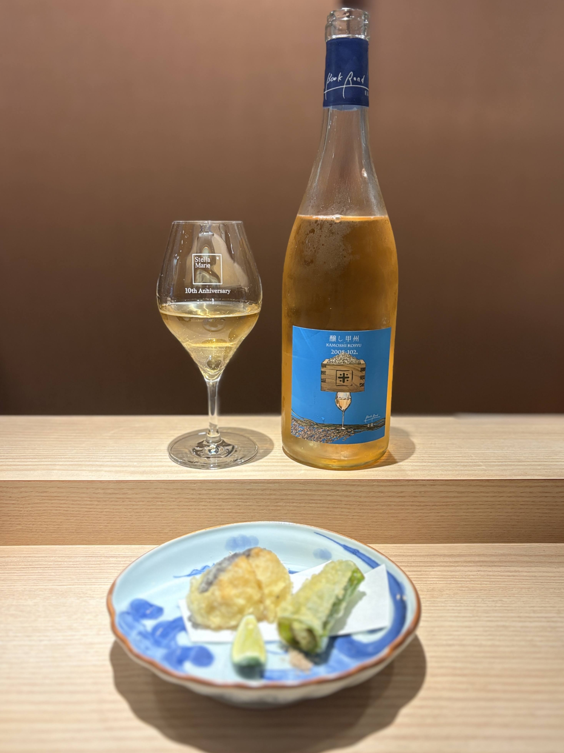 エビしんじょう、シイタケ、シシトウ。どの天ぷらにもマリアージュしました。魚介や野菜は、甲州によく合います。食材を生臭く感じさせず、また搾ったすだちとも相性がよい。甲州は日本酒の吟醸香に似た香りをもつものが多く、そこも和食とベストマッチしています。